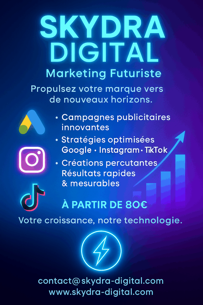 Affiche professionnelle au style futuriste, pensée pour présenter clairement une offre digitale et attirer l’œil instantanément.